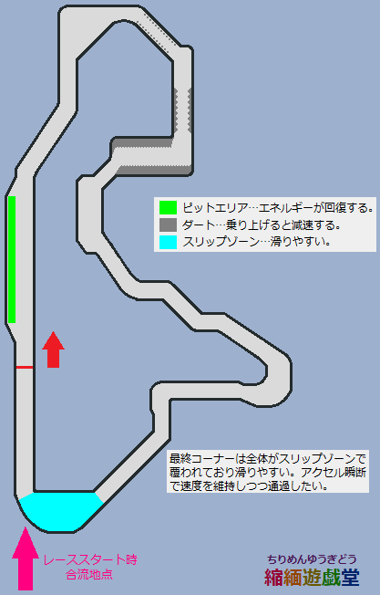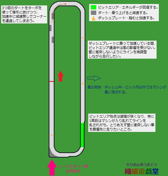 ・ピットエリアの区間は道幅がかなり狭くなる。他プレイヤーやバンパーとの衝突には注意が必要。また、ピットエリアもかなり短いため、序盤の周ではあまりガンガン使うとエネルギーを回復し切れない事も。他マシンとの衝突を考える必要のないタイムアタックと異なり、レースでは1〜2周目は多少エネルギーをセーブする必要も出て来るかも。