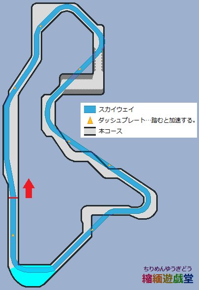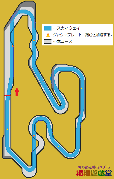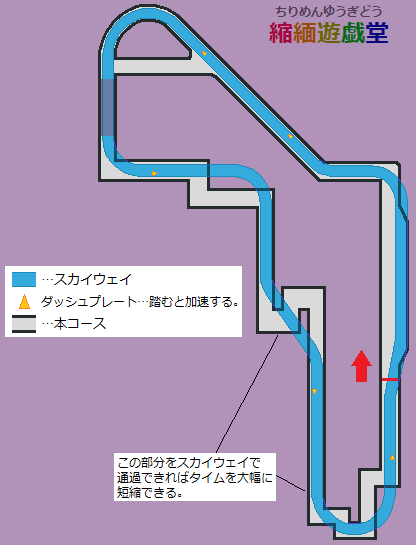 ・スカイウェイはショートカットになる部分が無く、本コースの上空を普通に走るだけであり、他のコースと比較すると地上ルートを走るマシンとの差は縮まりにくい。最終ストレートのダッシュプレートから先には地面側にダッシュプレートが無いため、あえて言えばこの近辺で使うのがよろしいかも。…とは言え、どのみちそれほど効果は無いため、持ち腐れせずにパーッと使ってしまっても良いかも。