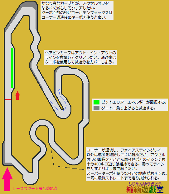 ・このS字カーブはどうしても減速してしまうため、エネルギー残量に余裕があるならばコーナー出口で壁にわざとぶつかり、反動でコース中央まで出てしまうのもアリ(マップ中のピンク色ライン)。当然かなり減速してしまうため、加速の鈍いファイアスティングレイやワイルドグースはコーナー出口でターボで加速したい。