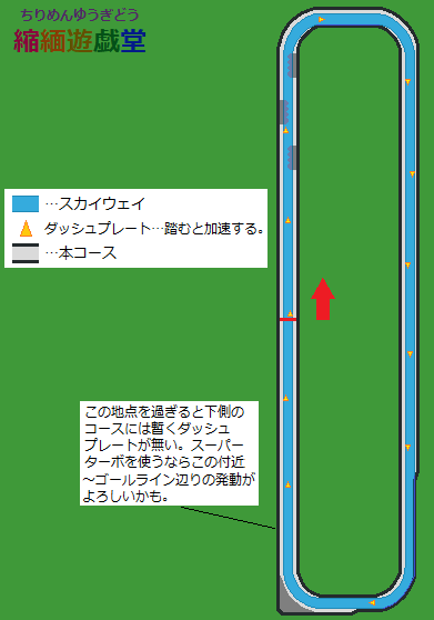 ・スーパーターボをここで使えるならこの場所がベスト。後半をまるっとショートカットして最後のストレートかその手前までスカイウェイで走れるため非常にラク。もっとも、スーパーターボが溜まりっぱなしのまま半周も1周も放置しているのはムダもイイトコなので、その辺は臨機応変にどうぞ。