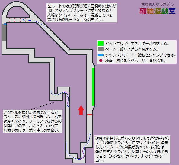 ・コース形状は大半のコーナーが直角・クランクだらけであり、壁にガツガツぶつかりやすい。トップを狙うなら悠長に走るワケにもいかないのだが、慣れない内はアウト・イン・アウト(=アウト側から入り直角のカドをかすめるように抜け、またアウト側に抜ける)で壁にぶつからずに確実に抜けるのを優先したい。このコースは周回毎の足切りは無いため、プレイヤーが落下死やエネルギー切れにならない限りは完走はできる。まずは完走を目指し、そこからタイム短縮のために少しずつ距離を縮めていきたい。