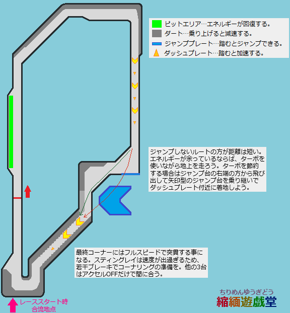 ・直線終わり際からはルートが分岐している。そのまま直進してジャンププレートで空中の矢印型のジャンププレートを乗り継いでいくルート(マップ中の赤色ルート)と、ジャンプせずに地上を走るルート(マップ中の緑色ルート)がある。距離的にはジャンプせずに走った方が短いため、ジャンプせずにターボを使いながら走行するのが一番速い。ジャンプするルートはエネルギーをケチって走りたい場合や赤バンパーが大量に発生して避けるのが面倒な場合に通ると良い。