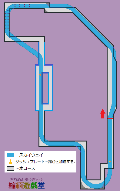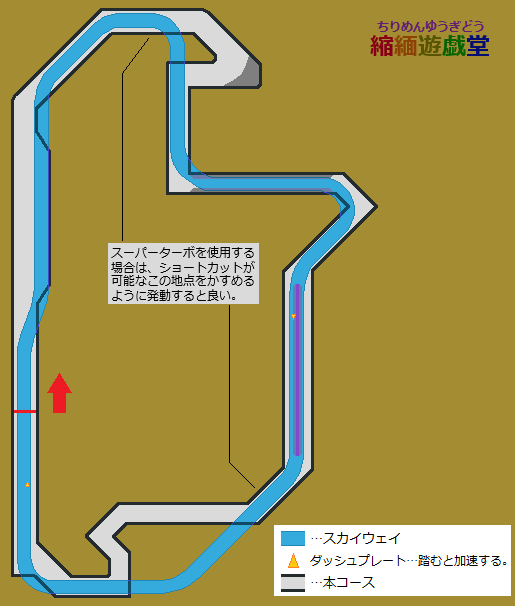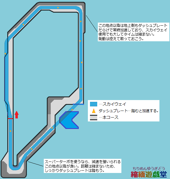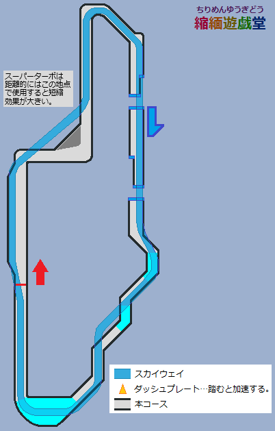 ・スーパーターボは地上にダッシュプレートの少ない地点で使いたい。中盤〜最終コーナー前はみっしりとダッシュプレートが配置されており、スカイウェイを走っても大して差は無くムダになりがち。減速が必要な最終コーナーから先で使うのがムダが少ないと思うが、本コースのスカイウェイは距離は縮まないため、タイム短縮のためにはスカイウェイのダッシュプレートをしっかり踏む必要がある。急カーブが無く見通しは良いため、焦らずしっかりとダッシュプレートを乗り継いで行きたい。