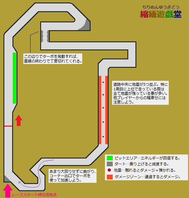・2ヶ所目の2連続の直角カーブはカーブとカーブの間の距離がかなり短く、連続のコーナーと言うよりは1つのヘアピンカーブの要領で曲がると良い。続く直線区間は道路中央に地雷が並ぶ。道の端側はダメージゾーンになっており、安全に走れる幅が極端に狭い。1周目の上位では殆どの地雷が残っている事が多い。他プレイヤーからの幅寄せで地雷にぶつからないよう注意しながら走りたい。