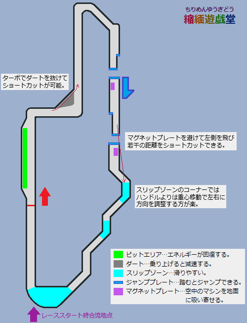 ・前半の難所は3個目のコーナーで、かなり急なのでファイアスティングレイ以外は速度を維持しにくい難所。あらかじめ若干マシンを右に向けて左側にスライドしておくと、旋回角度を小さくできて減速を抑えられる。このカーブの直後にはジャンププレートがあるため、ターボを使ってもジャンプで減速する分ムダになりやすい。できればこの地点ではターボを使わず減速も抑えて走りたいところ。