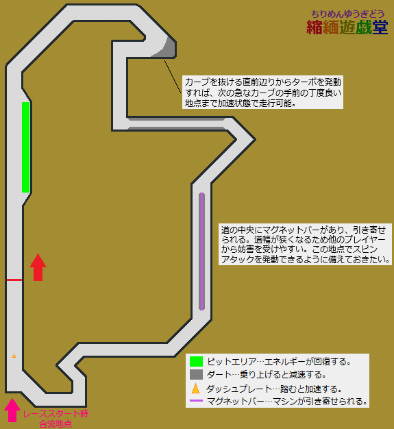 ・コース中盤のストレートの真ん中にマグネットバーが設置されており、安全に走れる幅が非常に狭い。他のマシンとの接触機会が多いので、この地点でスピンアタックを使えるようにしておくと良い。妨害を受けずに抜けられそうな時は、近場の他のプレイヤーに攻撃/幅寄せしてみるのもアリ。