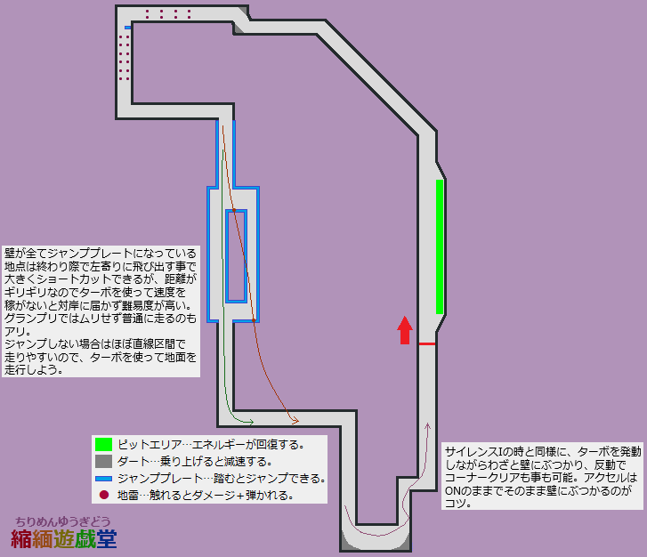 ・コース後半はサイレンスIとほぼ同様の形状で、同じ感覚で走行可能。ターボを使ってわざと壁にぶつかって反動で抜ける走法も流用できる…が、赤バンパーが大量に走っていてただでさえ避けるのが難しいため、バウンド走法はタイムアタックだけにしておいた方が無難か。