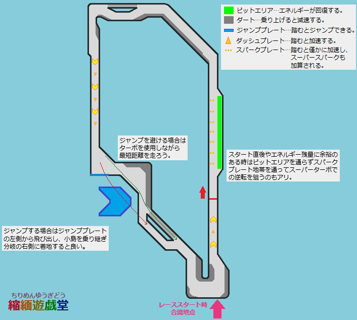 ・直前に他マシンと接触するだとかで体勢が良くない場合やジャンププレート地点が混雑している場合は空中での衝突で即コースアウトに繋がるため、ジャンプせずに左に曲がってターボを使い、分岐の左側のダートをショートカットするルートを通ると良い。こちらは地上を走る分、ターボさえ使えば速度ではジャンプするルートよりも速い。エネルギーが余っている場合はあえてジャンプせずに地上を走る選択も十分アリである。
