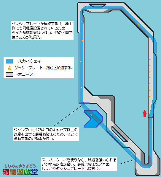 ・スカイウェイは距離を大幅に短絡する場所が無いので、スーパーターボは地上にダッシュプレートが少ない場所で発動した方が良い。バックストレート付近は地上側にも多数ダッシュプレートがあるので、この地点で発動しても大してタイムは縮まず損なので、この地点以外を通る場面で使った方が効率が良い。