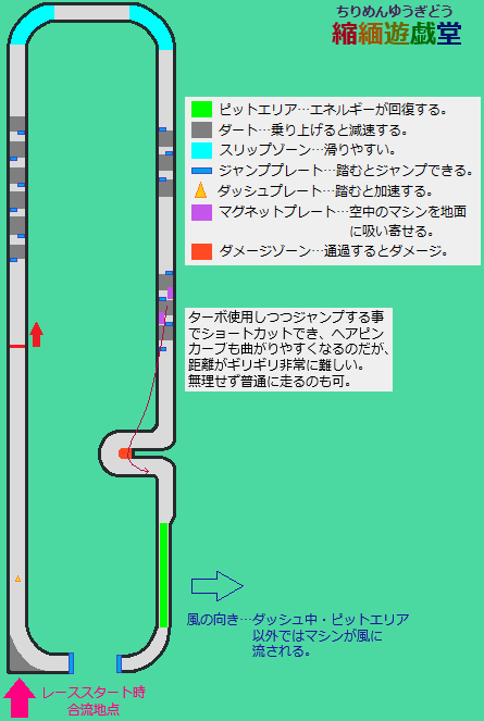 ・直後のピットエリアは距離が短めゆえ、ダメージを回復するには多少の減速が強いられる事も。ダメージの蓄積度合い次第だが、ファイナルラップのラストでターボを使えるくらいのエネルギー残量は欲しいところ。序盤のラップの内は多少減速しても回復を優先したいところではある。エネルギーに余裕がある場合は、ヘアピンカーブを抜けた後にターボを使ってタイムを縮めるのも一興。ただ、直後のジャンプで多少加速できるため、よほど減速して飛距離が足りないとかでなければ、ムリにターボを使う必要は無いかな、と。