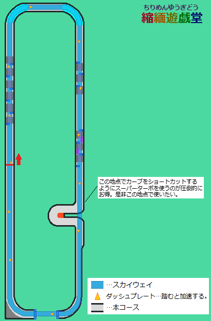 ・スカイウェイを使う場合はスタート後の最初のコーナーのやや手前くらいがベスト。普通に走ると何かしら減速を伴う急なカーブをまるまる飛び越えられる上にダッシュプレートで加速もできるため、ショートカット効果が非常に大きい。