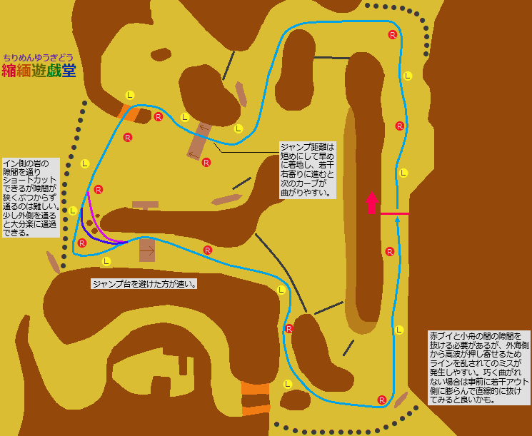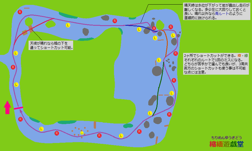 ・マップ中の橙色ルートと緑色ルートを走行する事で、視界が悪く岩の脇を通る必要のあるカーブをショートカット可能。それぞれ1回分のミスになるため、他でミスしなくても3周全部をショートカットするのは不可能。1周目は他でミスする可能性も考慮して通常ルートを安全に走り、2周目以降で余裕のある時にショートカットするのがよろしいかも。