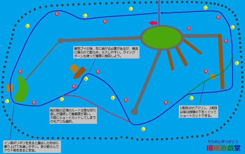 ・コース終盤もハード以下と同じ要領で走れるが、やはり2周目以降はイン側の砂浜が露出して乗り上げると大きくタイムロスに繋がりやすい。多少余裕を持って膨らみつつ走行した方が結果的には無駄が少なくなりやすい。COMに先行を許している場合は逆転狙いでタイミングを見計らってインギリギリを走るのもアリだが、かなり運が絡むため却って墓穴を掘りやすいのが難点。