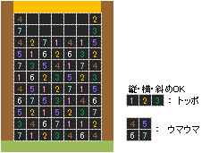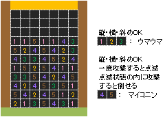 ・一定時間内に2回攻撃を加えないと消せないマイコニンが2色、みっちり詰まったマップ。ただし、それぞれのモンスターが最初から斜めに多数連なった状態で配置されているので、ダイヤ化は非常に容易。特に狙い目なのが最上段、最初から5つにリーチが掛かっているピンクのウマウマが狙い目。真ん中の茶色のマイコニンをどかしてピンクの爆弾を放り込むだけでダイヤ化が狙える。ここでどちらかのマイコニンを全滅させられればだいぶ楽になる(確率的には3色あるウマウマの色のダイヤになる方が高いが)。 ・他だと紫のマイコニンが左上から右下、右上から左下に4つ連なっている箇所があり、茶色のマイコニンも多少配置を変えれば4つ連なる。ただ、マイコニンでのダイヤ化は「爆弾が2個フィールドにあってすぐに消せる時」で無いと狙いづらい(1回攻撃を加えた段階で次の爆弾を待っても大抵時間切れで点滅状態から復活してしまう)。 |