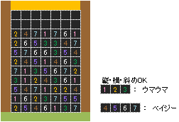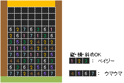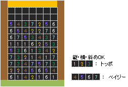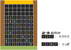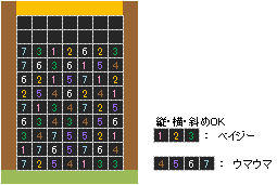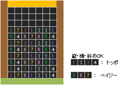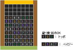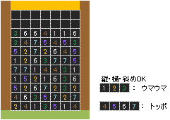 ・中央の列にぽっかりと下まで貫通する穴が開いているため、最初に落ちてきたトッポの色に合わせて素早く穴の部分にトッポを縦に並べてダイヤ化を狙うと良い。巧く紫・茶色のマイコニンの色のダイヤになってくれれば大儲けだし、トッポの色になっても大幅にフィールドのモンスターを減らす事ができる。 ・1色消した後も同じ要領で簡単にモンスターを全滅させられるため、一度もワリオタイムに入らせずにクリアも十分可能。 |