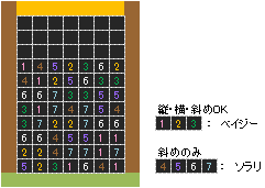 ・斜めでしか消せないソラリが4色も登場するかなり鬱陶しいマップ。 ・どの色のモンスターも配置はかなり散っているため、初期の配置ではダイヤ化は狙いにくい。ヘタに組み替えてダイヤ化を狙うと却って時間が掛かったりするため、降って来た爆弾からサクサク利用して地道に数を減らすのを優先した方がよろしいかも。 ・フィールドが埋まった状態でワリオタイムに入ると動き場所が確保しづらく難儀する。できれば最初のワリオタイム突入までに2〜3行分くらいは減らしておきたいところ。 |