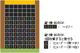 ・2回攻撃を加えないと消せないヒュードーが真ん中付近の行にギッシリ埋まった面倒な事この上ないマップ。 ・幸いな事に、上の方には3色のベイジーが斜めに3体並んだ初期配置になっている。ピンク・黄色・緑のいずれかの爆弾が1個降ってくれば、簡単にダイヤ化を狙えるため、初手から何個かはそれらの色の爆弾を待つのが良い。運良くヒュードーが全部消えてくれれば一気に楽になるし、ベイジーしか消えなくとも損にはならない。 ・上の行のベイジーが減った状態でヒュードーの行まで行き着いてしまった場合は、ヒュードーは1度の攻撃では消せないため、ヘンに待ちモードになるよりは、地道に自力で消す事に切り替えて行った方が良い。 |